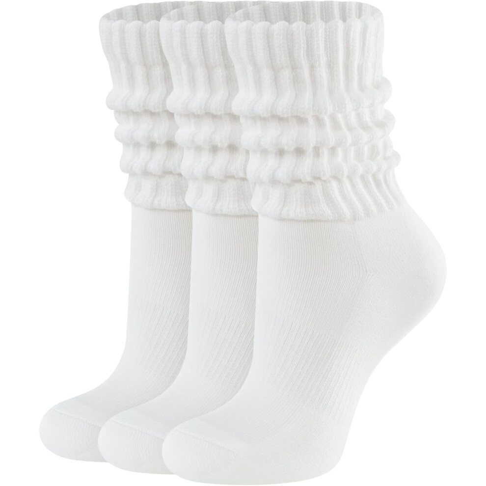 Women's Scrunch Crew Socks Retro 3-Pack Solid Cotton Boot Calf Socks Chunky Ribbed Cozy Slouchy Socks Size 5-11(White/White/Black)