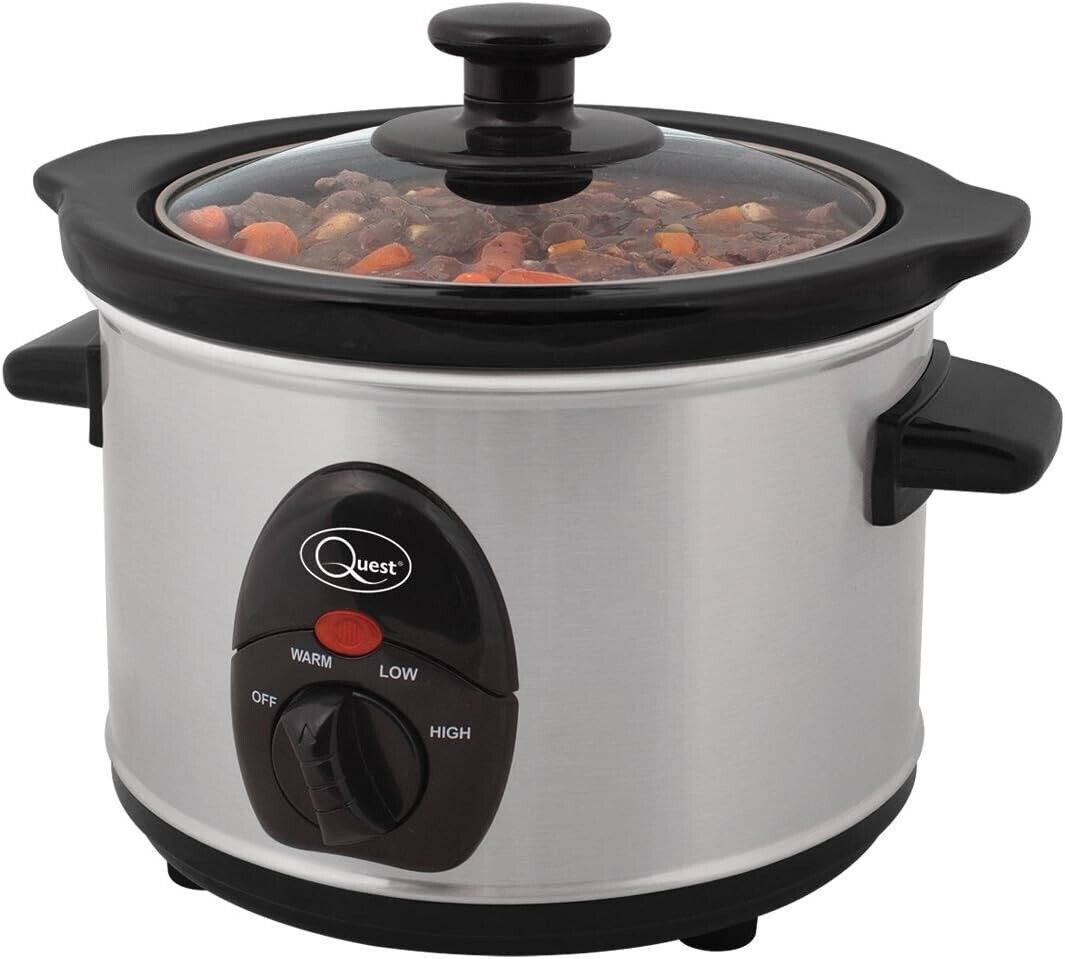 Quest 35260 Slow Cooker / 1.5 Litres/Compact Stainless Steel / 120W / 3 Temperature Settings/Transparent Toughened Glass Lid/Dishwasher Safe