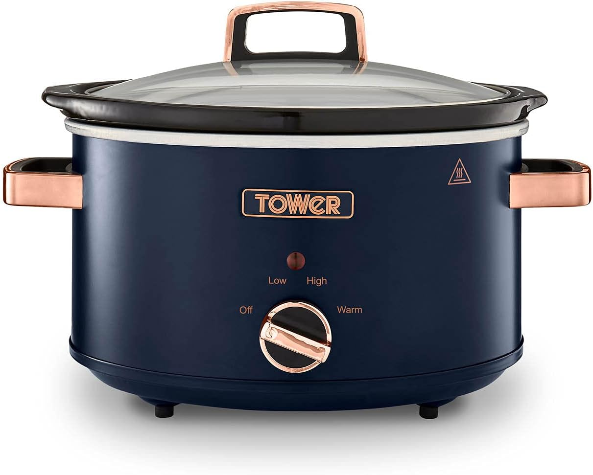 Tower Cavaletto 6.5 Litre Slow Cooker with 3 Heat Settings, Removable Dishwasher Safe Pot, Cool Touch Handles, Up to 8 Portions, Midnight Blue and Rose Gold, T16043MNB
