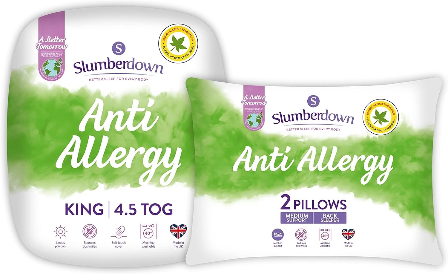 Slumberdown Anti Allergy King Size Duvet - 10.5 Tog All Year Round Quilt Ideal for Summer & Winter, 2 Medium Support Pillows - Anti Bacterial, Soft Touch Cover, Machine Washable, Size (225cm x 220cm)