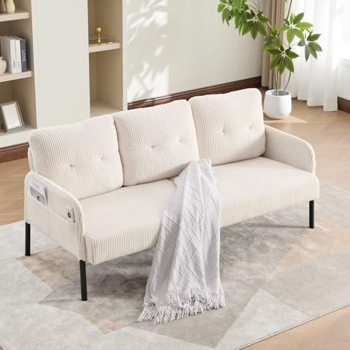 DRIXNO Modern Corduroy 3 Seater Sofa, Plush Settee with Double Side Pockets & Black Metal Legs, Compact Couch for Small Living Room, Bedroom, Flat, Student Dorm, Cream Beige