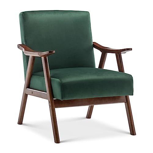 Green Velvet Armchair – Mid-Century Modern Accent Chair with Wooden Frame, Retro Green Velvet Chair for Living Room, Small Lounge or Bedroom, Compact Seat for Small Spaces, Stylish Armchair