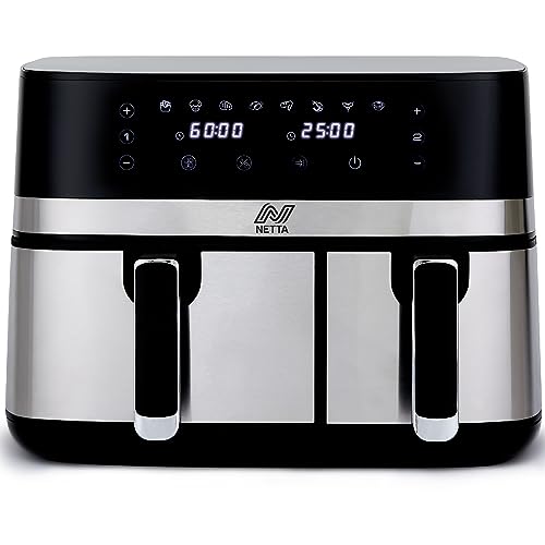 NETTA 9L Dual Basket Drawer Air Fryer with Digital Smart Programmes Double XL Family Size Small and Large Drawer - Black