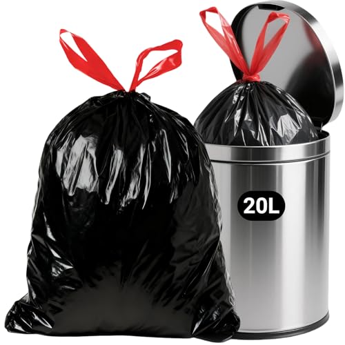 OKKEAI Small Black Bin Bags 20L, Strong Pedal Bin Liners Drawstring Bathroom Waste Bags, 60 Count Tear-Resistant Easy-Dispense Plastic Rubbish Bags for Bathroom, Office Bins