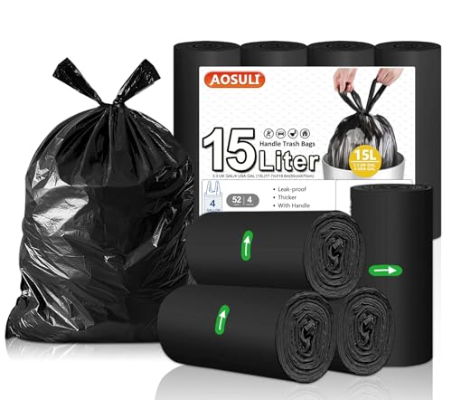AOSULI 15Liter Bin Bags with Tie Handles 52 Counts Trash/Garbage Bags Black Small Pedal Bin Liners for Home Office, Lawn,Bathroom,Toilet Wastebasket (Fits 0.8,1.5,1.2 3 4Gal Gallon Bins)