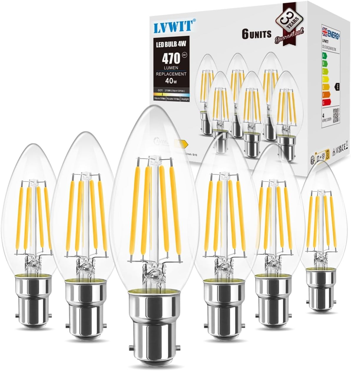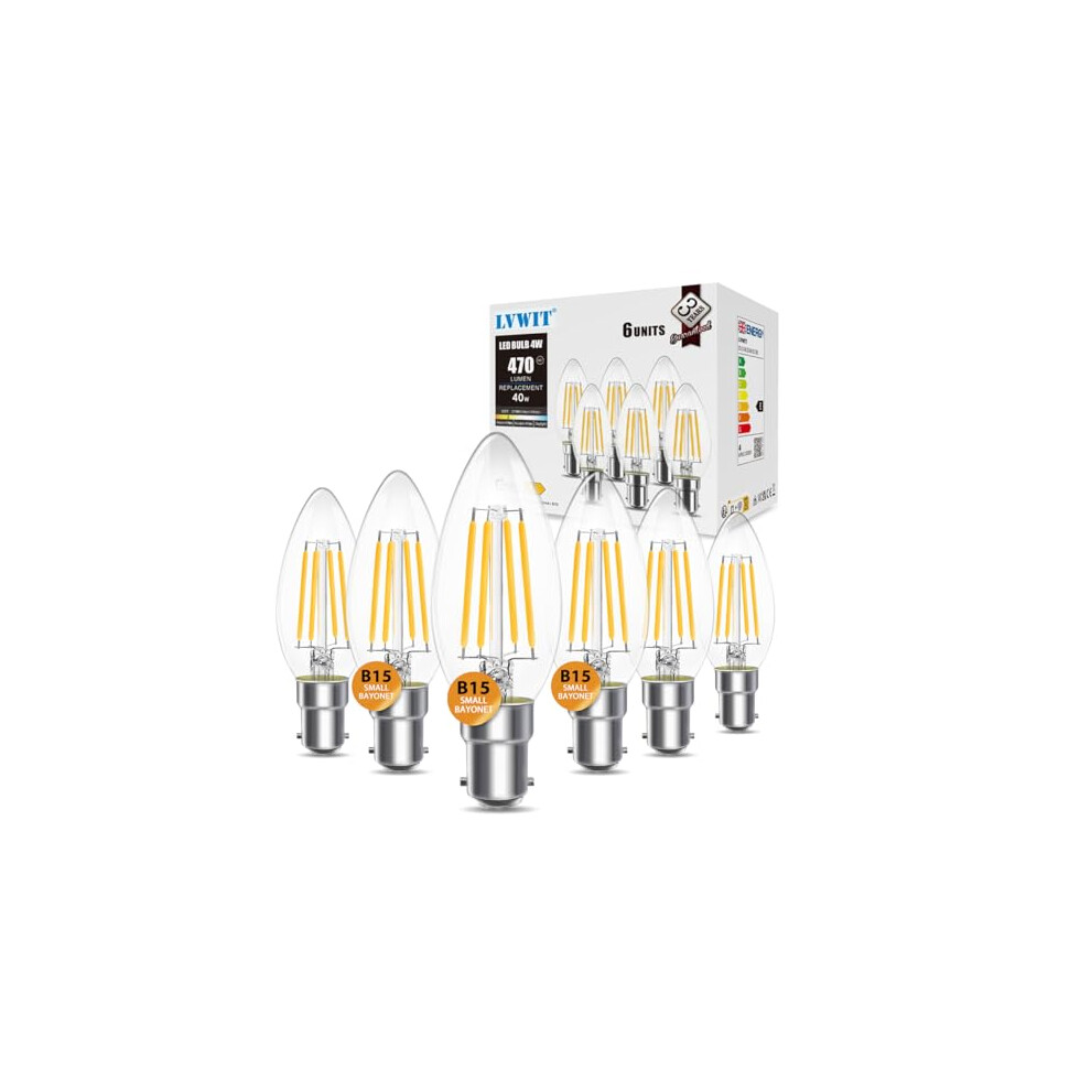 LVWIT 4W C35 Small Bayonet Bulb 40W Incandescent Bulbs Equivalent, B15 LED Filament Candle Bulb,470Lm, 2700K Warm White Candle B15 Bulbs Small Bayonet,220-240V,NO-Dimmable,(35MM*97MM/ 6 PCS)