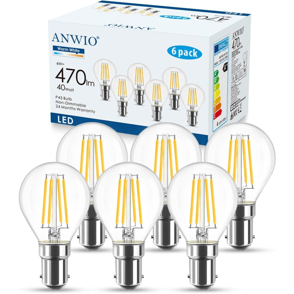 ANWIO B15 LED Golf Small Bayonet Filament Bulb 40W Equivalent, 4W Small Bayonet P45 Golf Led 2700K Warm White Led Light Bulb Bayonet, 470Lm,220-240V,77 * 45MM,Non-Dimmable(6 PCS)