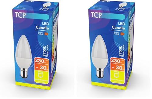 TCP 30W 2700K 330L B15 LED Candle Small Bayonet Light Bulb, Warm White HOALC330WOB12527N1P (Pack of 2)