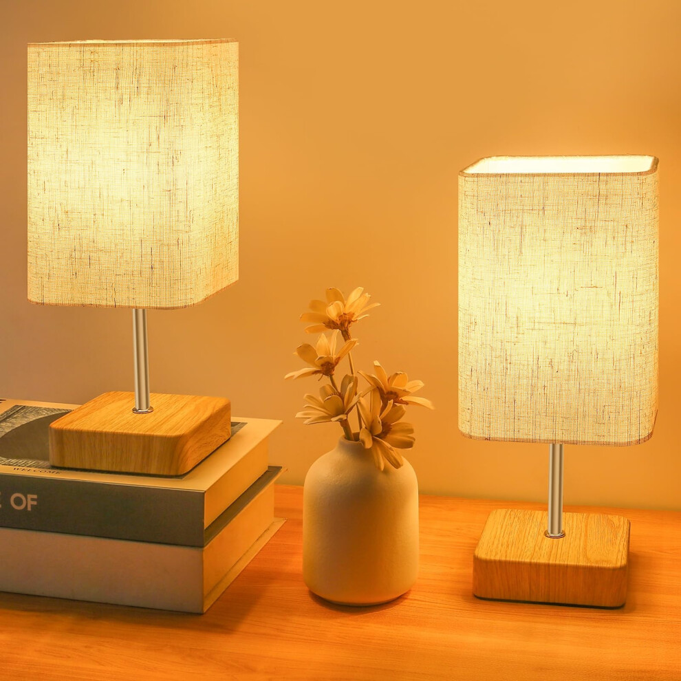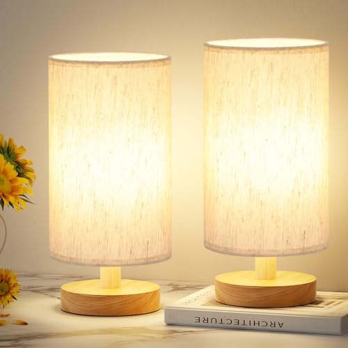 Bedside Lamps Set of 2, Small Table Lamp Minimalist Bedside Light with Linen Fabric Shade Classic On/Off Switch Natural Wooden Base Bed Side Reading Lamp for Bedroom, Living Room, Desk (Bulb Included)