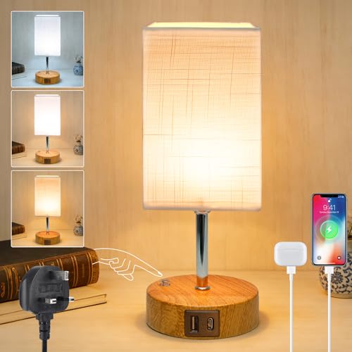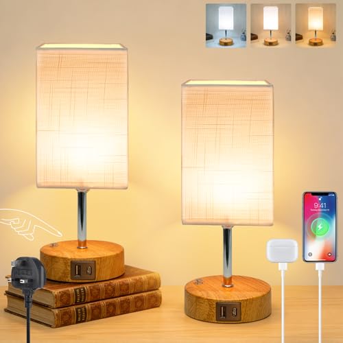 Wudyfei Touch Bedside Lamps, Small Dimmable Table Lamp with Wood Grained Base & Fabric Shade, 3 Colour LED Minimalist Bed Side Nightstand Lamp for Bedroom, Living Room, Kids Room, Study, Dorm, Office