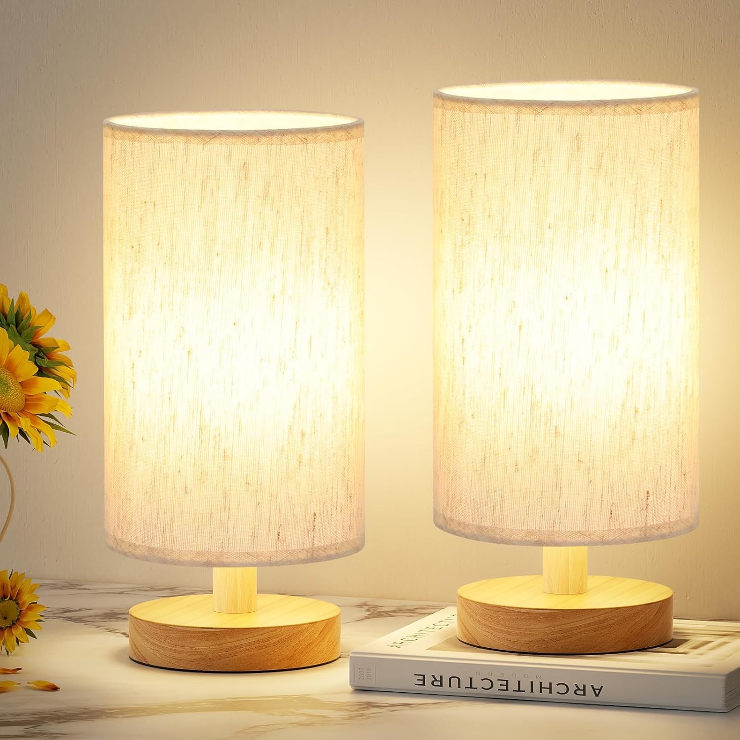 Wudyfei Touch Bedside Lamps Set of 2, Small Dimmable Table Lamp with Wood Grained Base & Fabric Shade, LED Minimalist Bed Side Nightstand Lamp for Bedroom, Living Room, Kids Room, Study, Dorm, Office