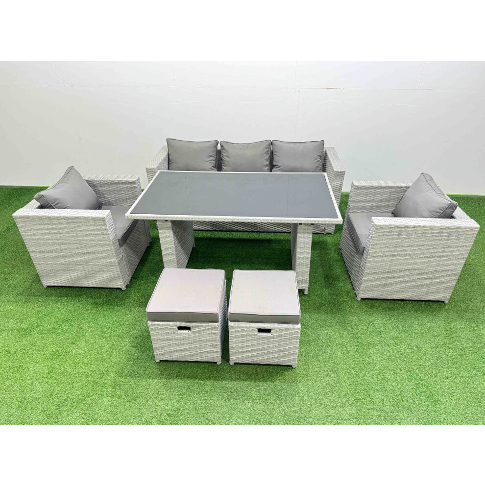 Fimous Patio Garden Furniture Sets with Black Glass Top Dining Table 3 Seater Sofa Armchair 2 Small Stool Light Grey