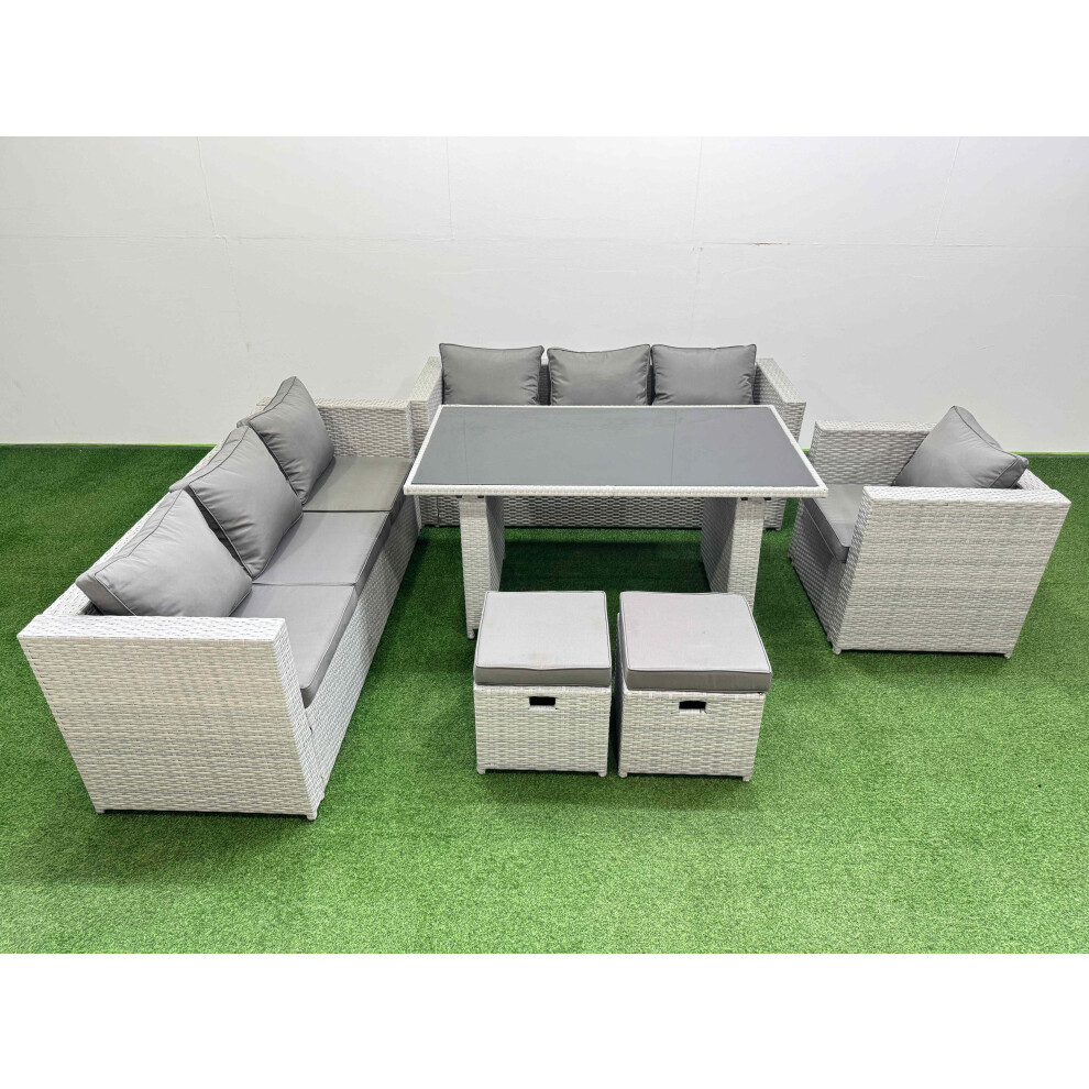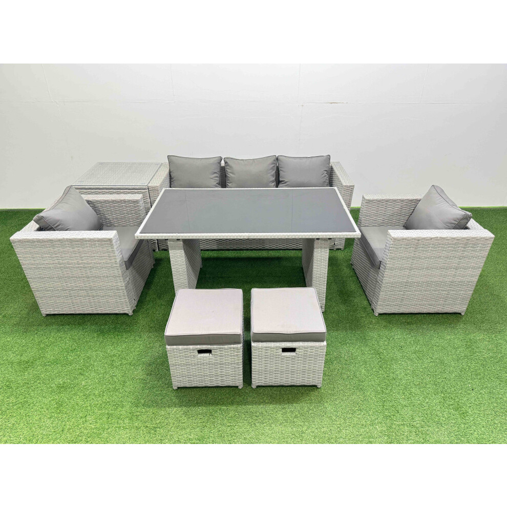 Fimous Patio Garden Furniture Sets with Black Glass Top Dining Table 3 Seater Sofa Armchair 2 Side Tables 2 Small Stool Light Grey