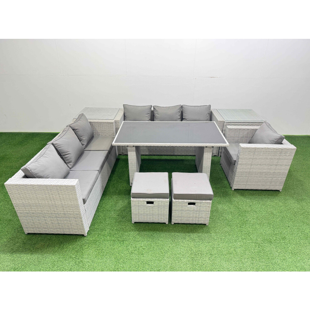 Fimous Patio Garden Furniture Sets with Black Glass Top Dining Table Armchair 3 Seater Sofa 2 Side Tables 2 Small Stool Light Grey