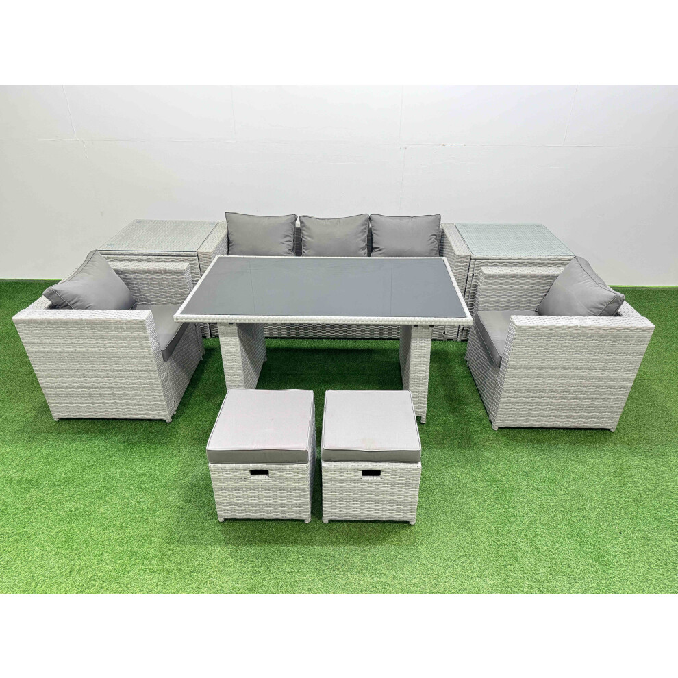 Fimous Patio Garden Furniture Sets with Black Glass Top Dining Table 3 Seater Sofa Armchair Side Table 2 Small Stool Light Grey
