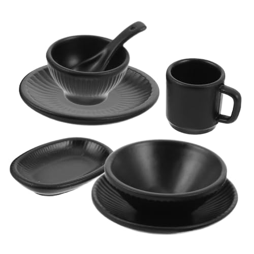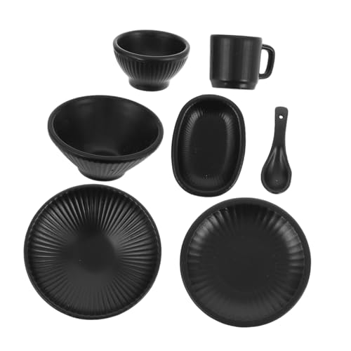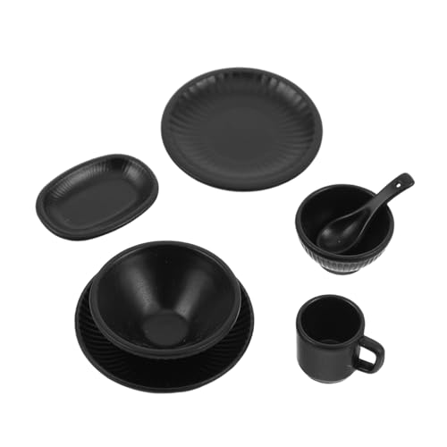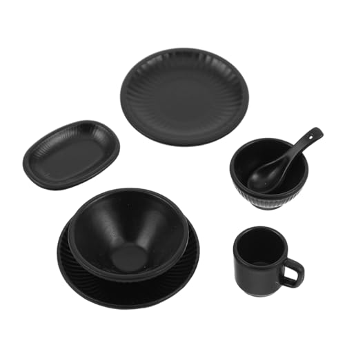 FUNNETOYU 7pcs Miniature Dollhouse Dinnerware Set Small Black Alloy Bowls Plates Mugs Pretend Play Accessories for DIY Kitchen Decoration Micro Landscape