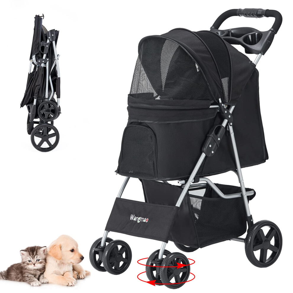 Pet Stroller for Medium Small Dogs and Cats, Folding Puppy Stroller Dog Cat Cage Jogger Stroller with Cup Holder and Storage Basket, 4 Wheels, Black