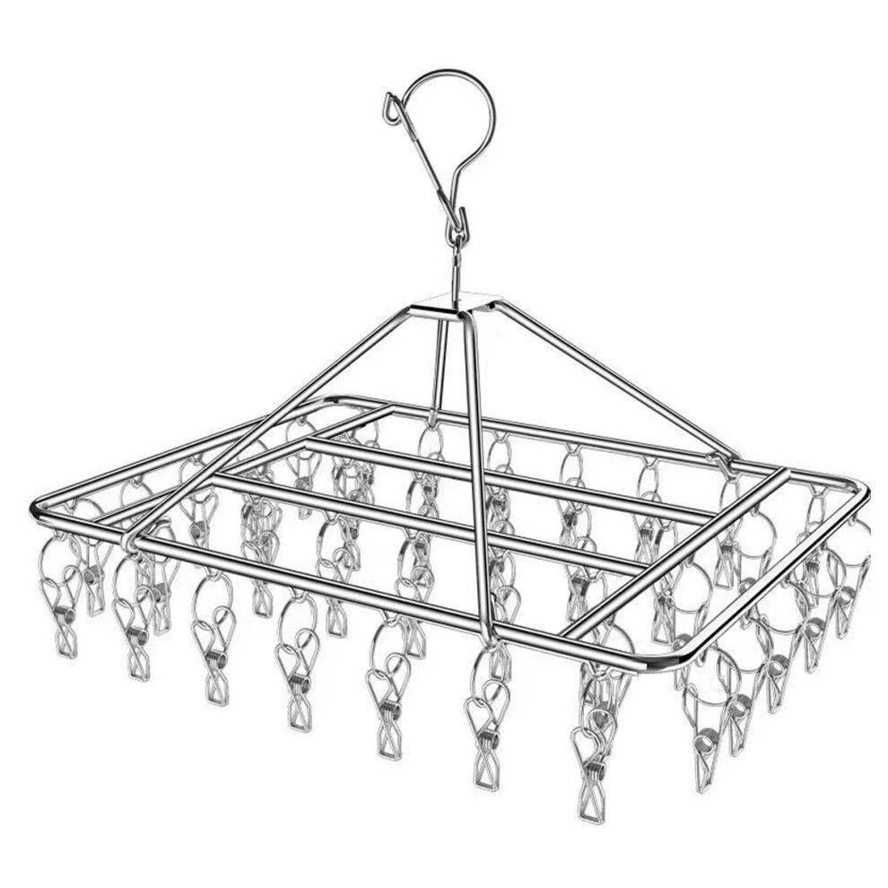 Swivel Hook Clothes Drying Rack Stainless Steel, Folding Windproof Hanger with Clips for Small Items, 360 Degree Rotation Durable Laundry Airer for So