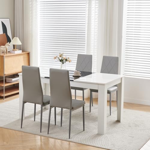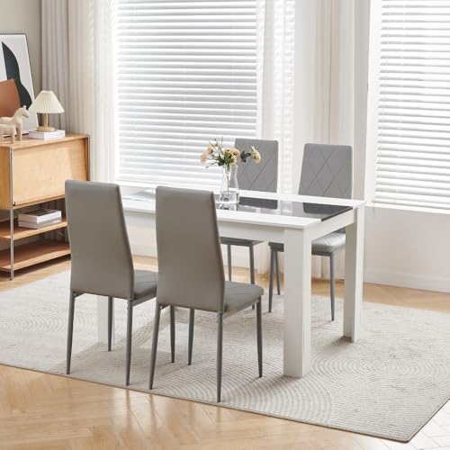 Menaka Modern Small Wood Dining Room Table and Chairs Set of 4 for Small Space, 5pcs 120cm Kitchen Table with 4 Seats Chairs Set (white leather line chairs, 120cm grey table, 4 chairs)