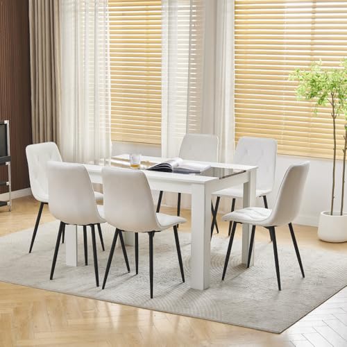 Menaka Modern Small Wood Dining Room Table and Chairs Set of 4 for Small Space, 5pcs 120cm Kitchen Table with 4 Seats Chairs Set (White Velvet Chairs, 150cm line table, 6 chairs)