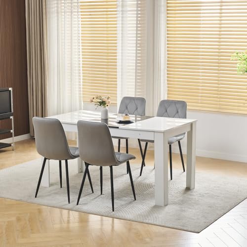 Menaka Modern Wooden Dining Room Table and Chairs Set of 4 for Small Space, 5 Pieces Rectangular Kitchen Table with 4 Chairs (white table and 4 grey velvet chairs)