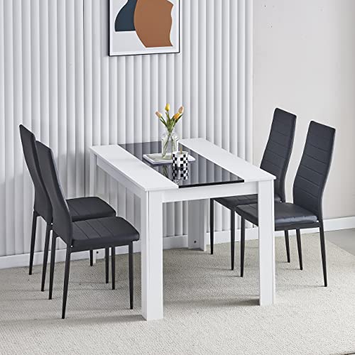 Menaka Modern Wooden Dining Room Table and Chairs Set of 4 for Small Space, 5 Pieces Rectangular Kitchen Table with 4 Chairs (110cm white table and 4 black leather chairs)