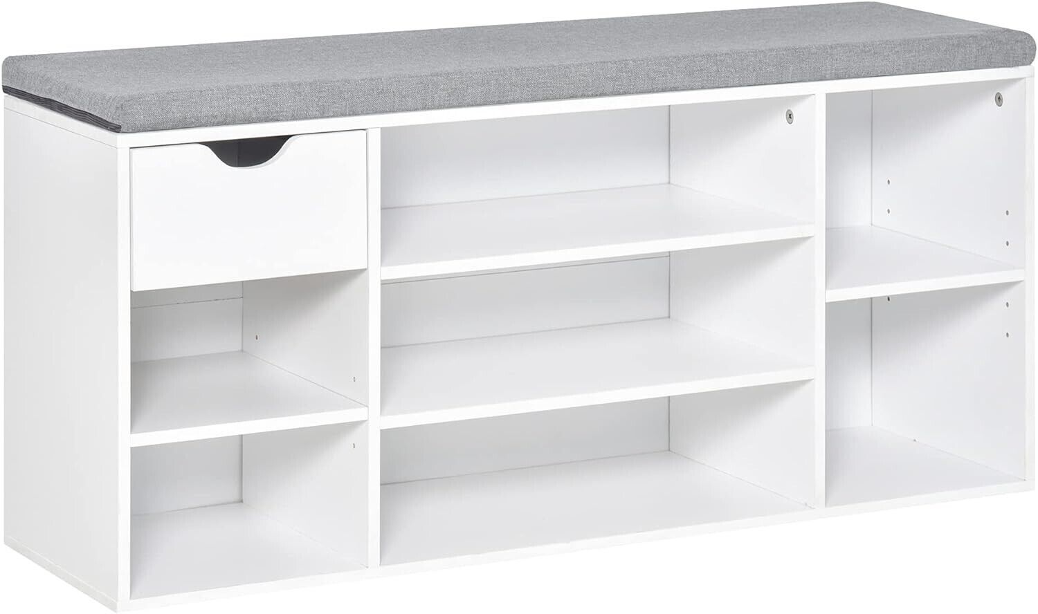 White Wood Shoe Cabinet Bench Grey Cushion Seat 7 Compartments Small Drawer Unit