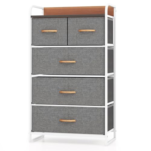 TAUS Small Chest of Drawers,Fabric Chest of Drawers Bedroom 5 Drawers Cabinet,Dresser for Bedroom With Handles,Wood Top and Sturdy Steel Frame,Light Grey