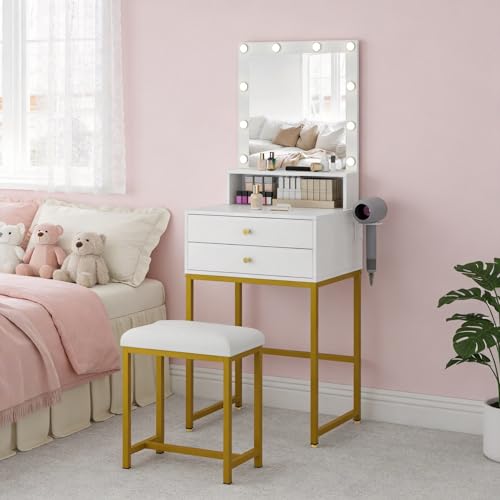YOURLITE Small Dressing Table with Lighted Mirror and Lights, Compact Vanity Table with with Drawers for Bedroom, Mini White Modern Makeup Desk with Hair Dryer Rack and Cushioned Stool(White and Gold)