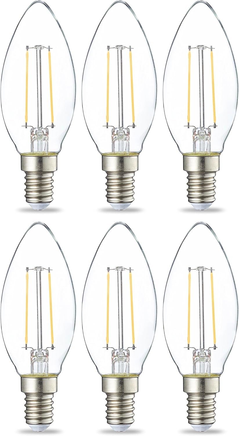 Amazon Basics LED E14 Small Edison Screw Candle Bulb, 2.1W (Equivalent to 25W), Clear Filament, Non Dimmable, Pack of 6, Warm White