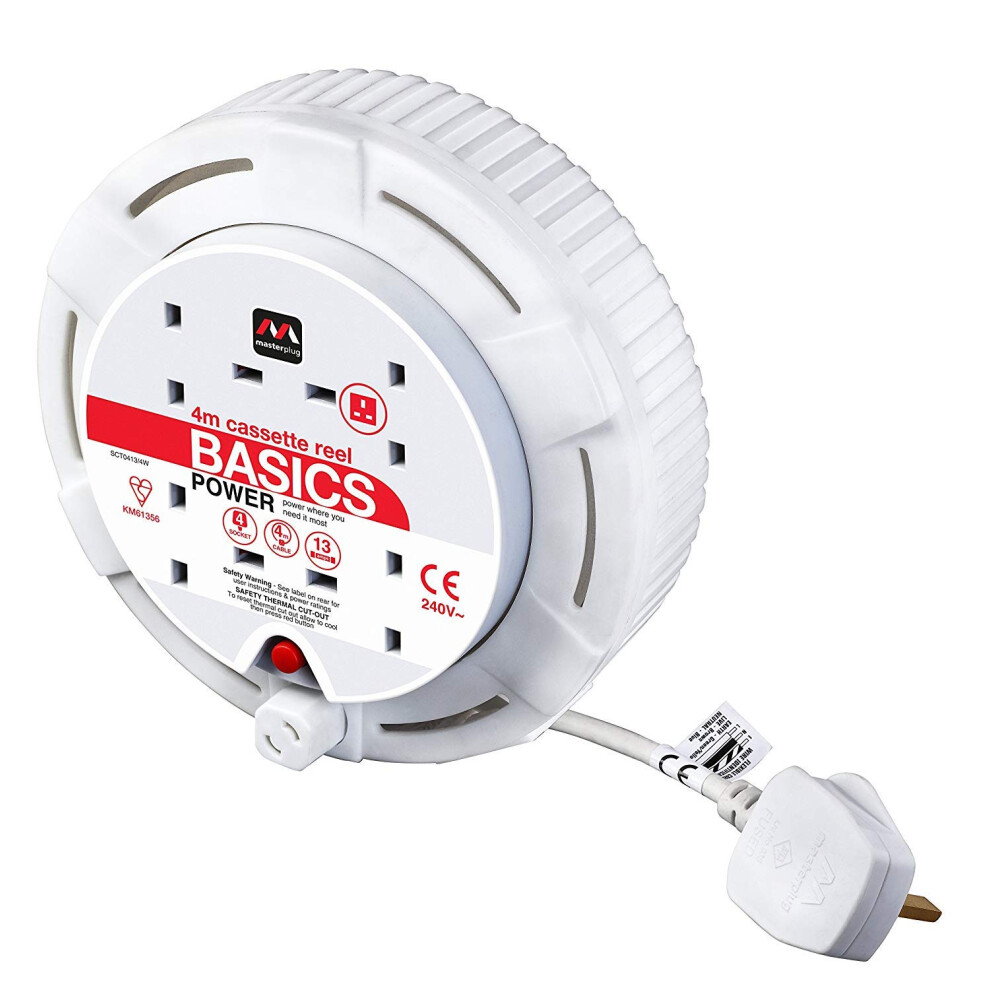 Masterplug Four Socket, 4 Metre Cassette Reel, Small Extension Lead Cable Reel, Wind-Up Retractable Power Cord Reel, Thermal Cut Out, Basic Power, Wh