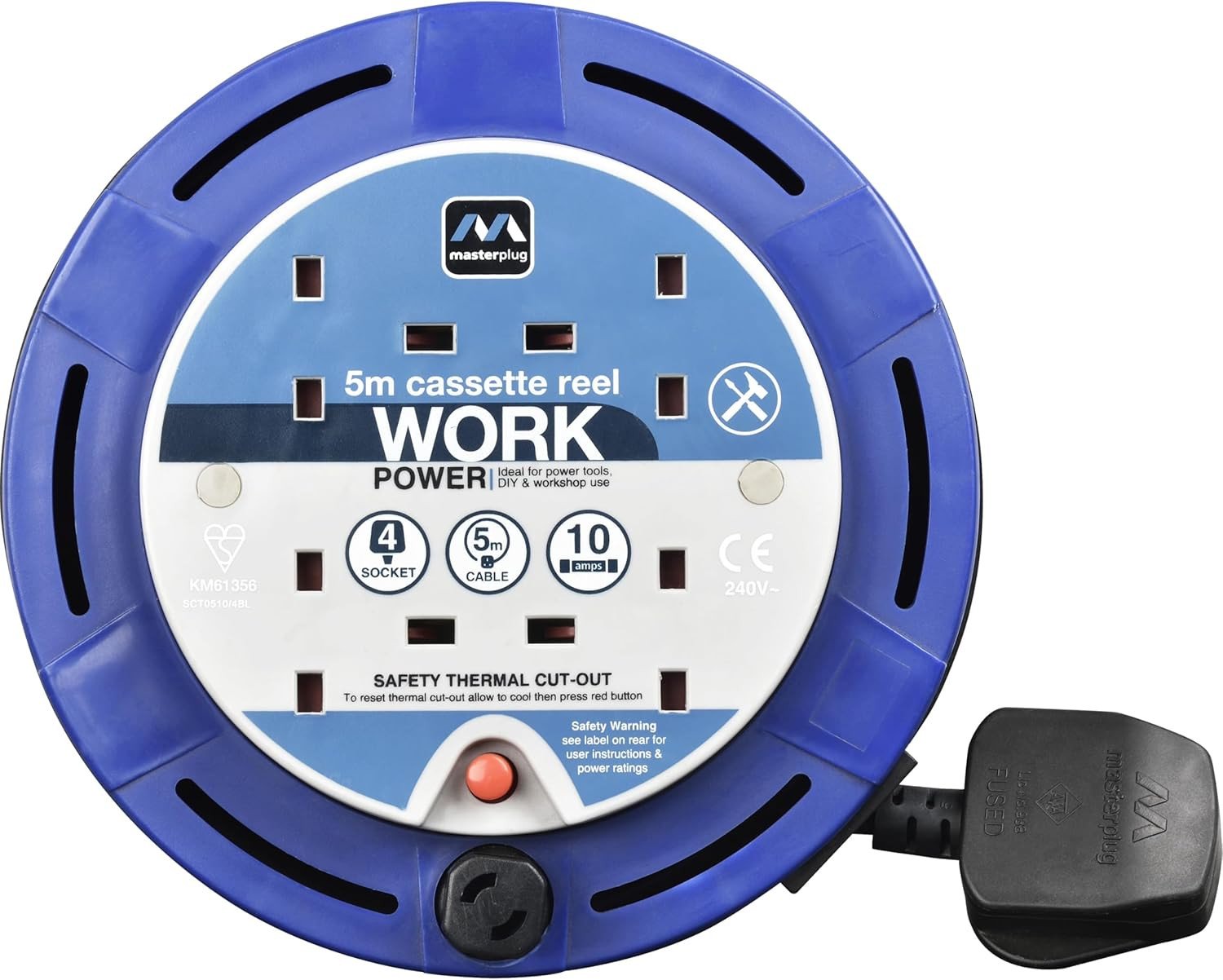 Masterplug Four Socket, 5 Metre Cassette Reel, Small Extension Lead Cable Reel, Wind-Up Retractable Power Cord Reel, Thermal Cut Out, Work Power, Blue/Black, 10A, 4G, 5m, SCT0510/4BL
