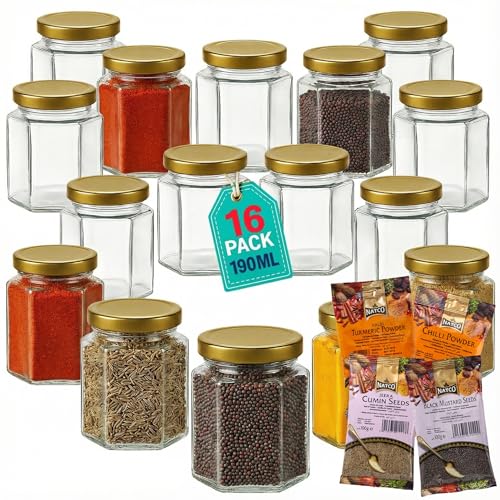 Jars with Lids Small Storage Glass Jars with Gold Lid with 4 SPICES | 190ml Hexagonal Glass Jars with Sticker Labels Spice Storage Jam Jelly Chutney- 16 Set