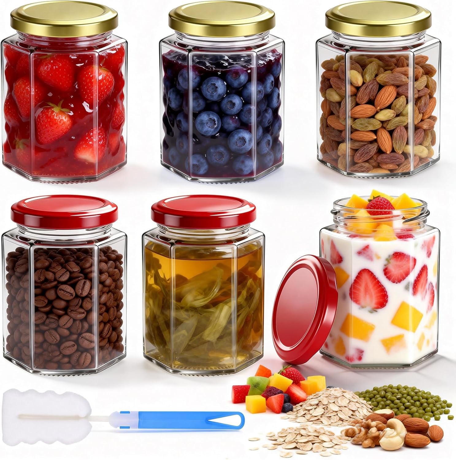Hejo Small Glass Jam Jars with Lids 280ml, 6 Pack Airtight Hexagonal Pickling J