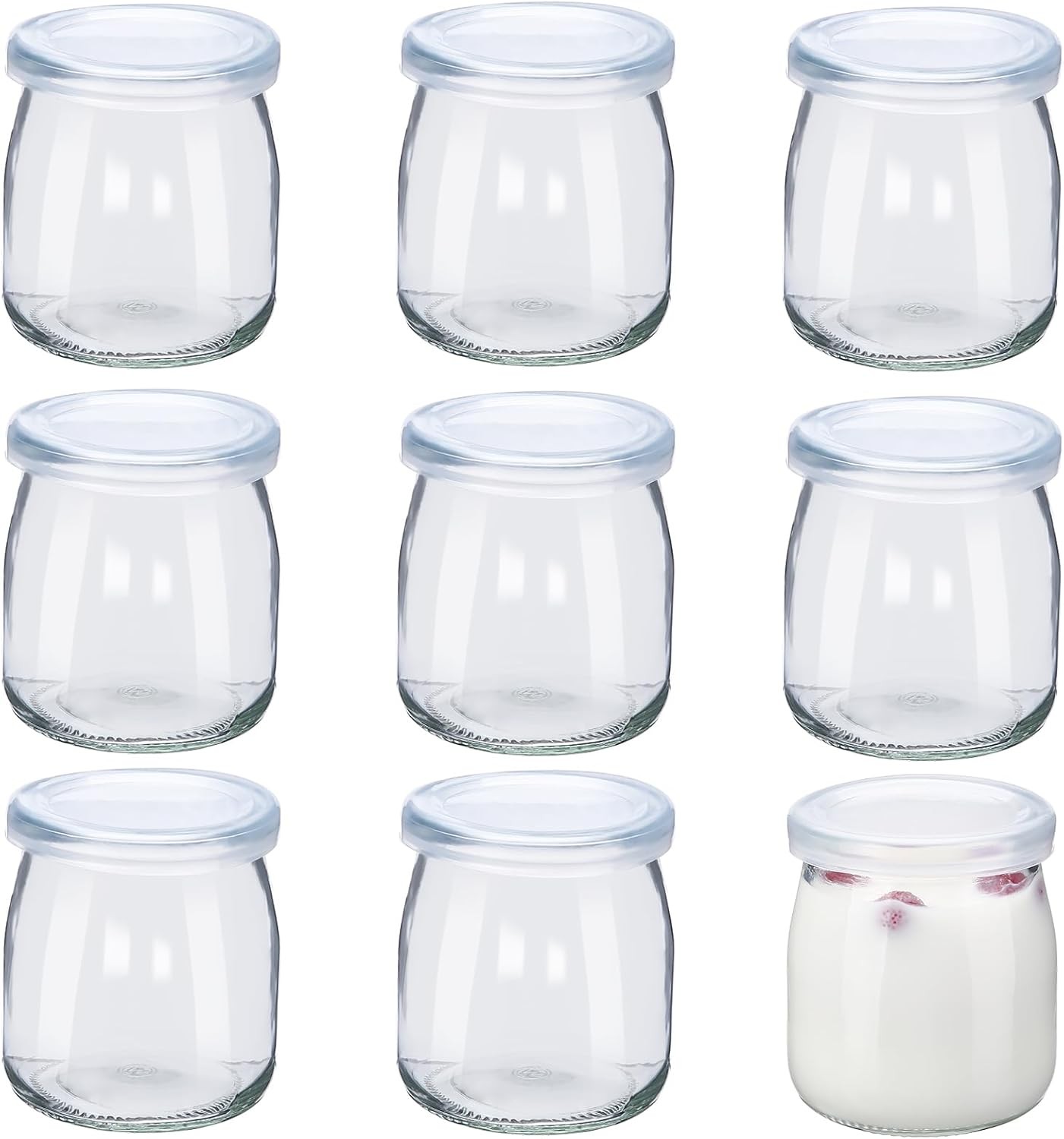 Meng Jiaran 9Pcs 7oz/200ml Yogurt Pudding Glass Jars with Plastic Lids, Small Glass Jars with Lids, Reusable Mini Clear Glass Bottles for Overnight Oats, Spice, Jam, Juice