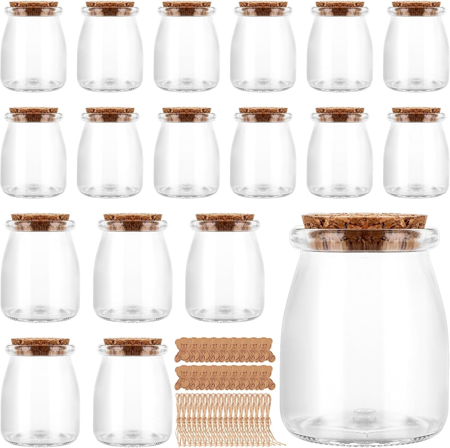 18 Pack 200ml Small Glass Jars with Cork Lids and Bear Tags, 7 oz Candle Jars M