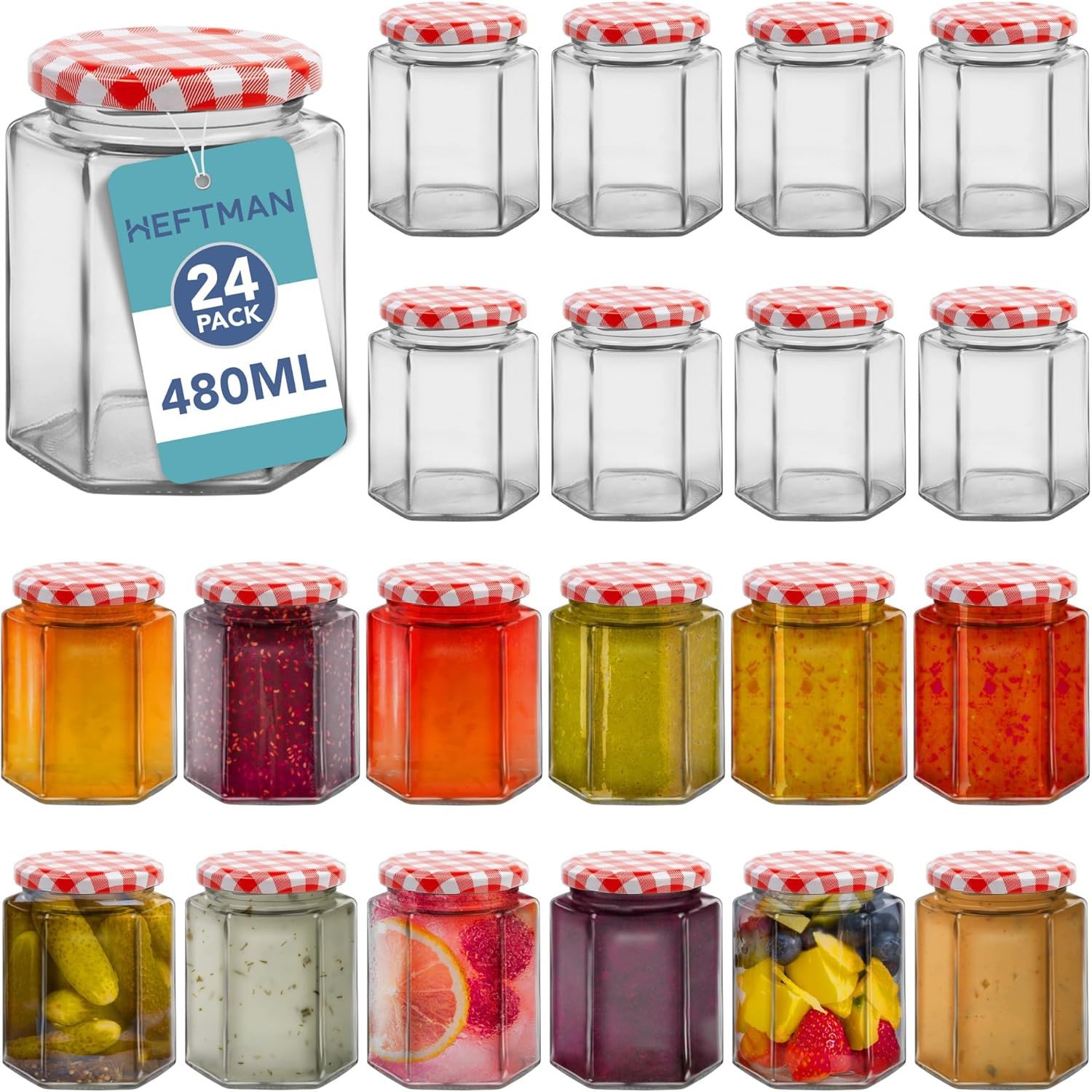 HEFTMAN Small Glass Jars with Lids - 24 Pack Airtight 480ml Jam Jars with Red Gingham Lids for Use as Pickling Jars, Glass Jars for Candle Making, Preserving Jars - Hexagonal Small Jars (Empty)