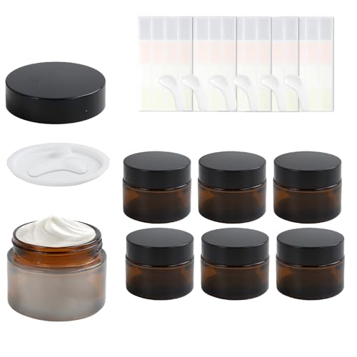 QZDAFFIC 6Pcs Small Amber Glass Jars with Lids, 50ml Cosmetic Jars travel Pots with Spatula and Labels, UV Protection Travel Containers for Toiletries Cosmetics Powder Creams