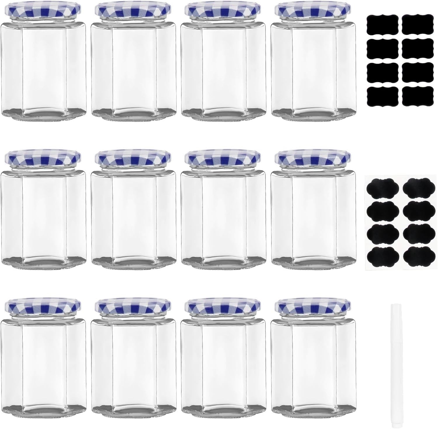 HEFTMAN Small Glass Jars with Lids - 12 Pack Airtight 480ml Jam Jars with Red Gingham Lids for Use as Pickle Jar, Jams, Honey, Candle Making, Preserving, Food Storage - Hexagonal Shape (Empty)