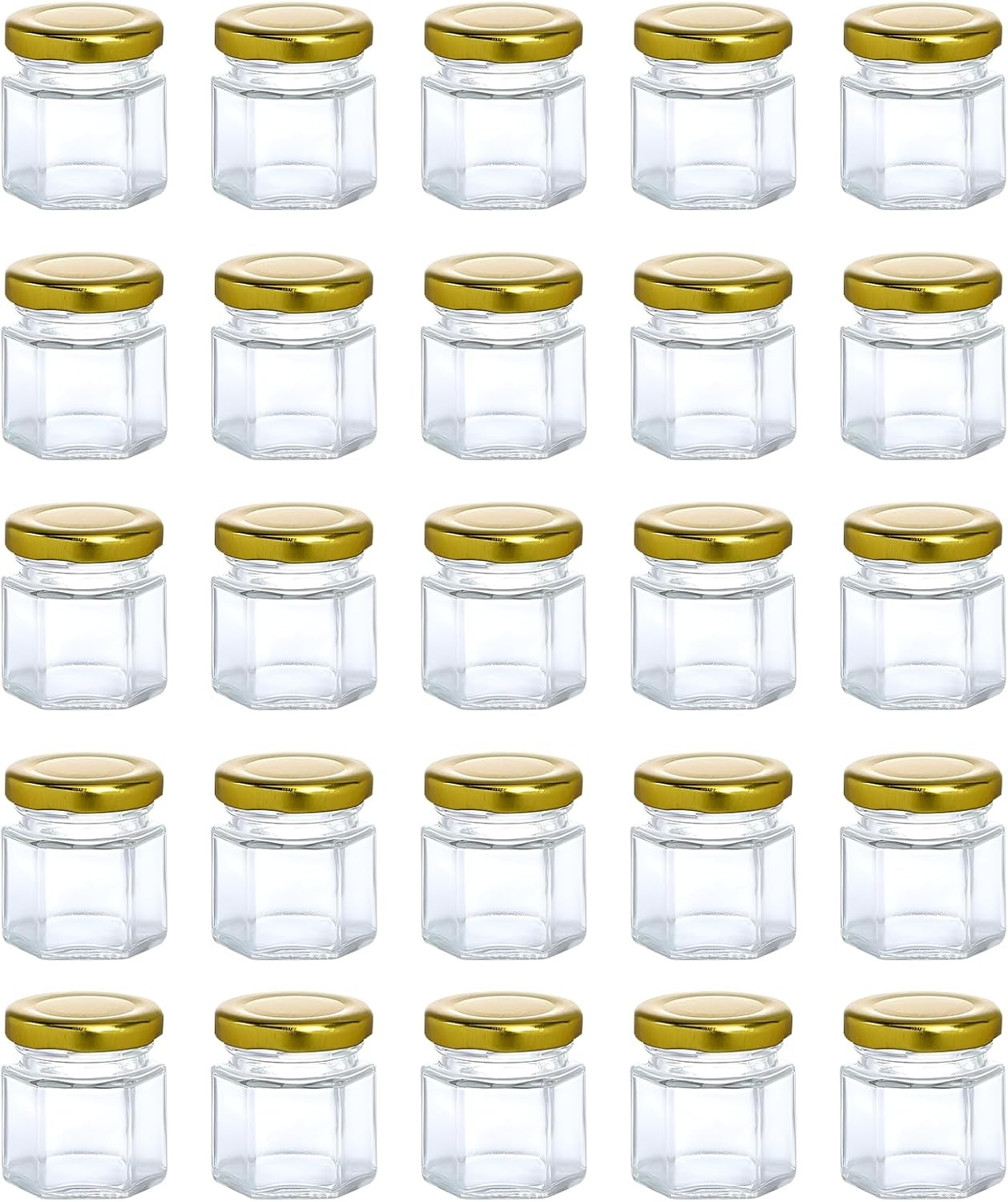 Hexagonal Glass Jars 48PCS 45ML Mini Mason Jars with Airtight Gold Metal Lid Small Glass Storage Jars for Preserves Pickles Jam Honey Spices Herbs DIY Crafts Wedding Favors Kitchen Containers