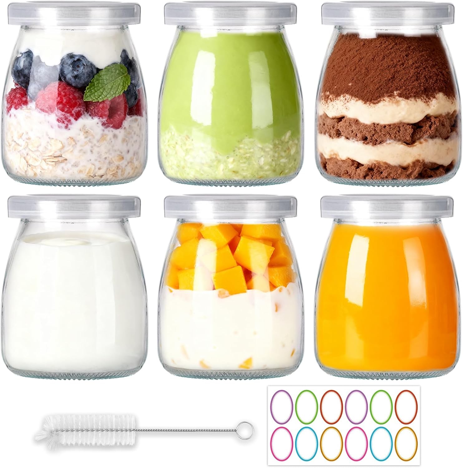 6Pcs 7oz/200ml Yogurt Pudding Glass Jars with Plastic Lids, Small Glass Jars wi