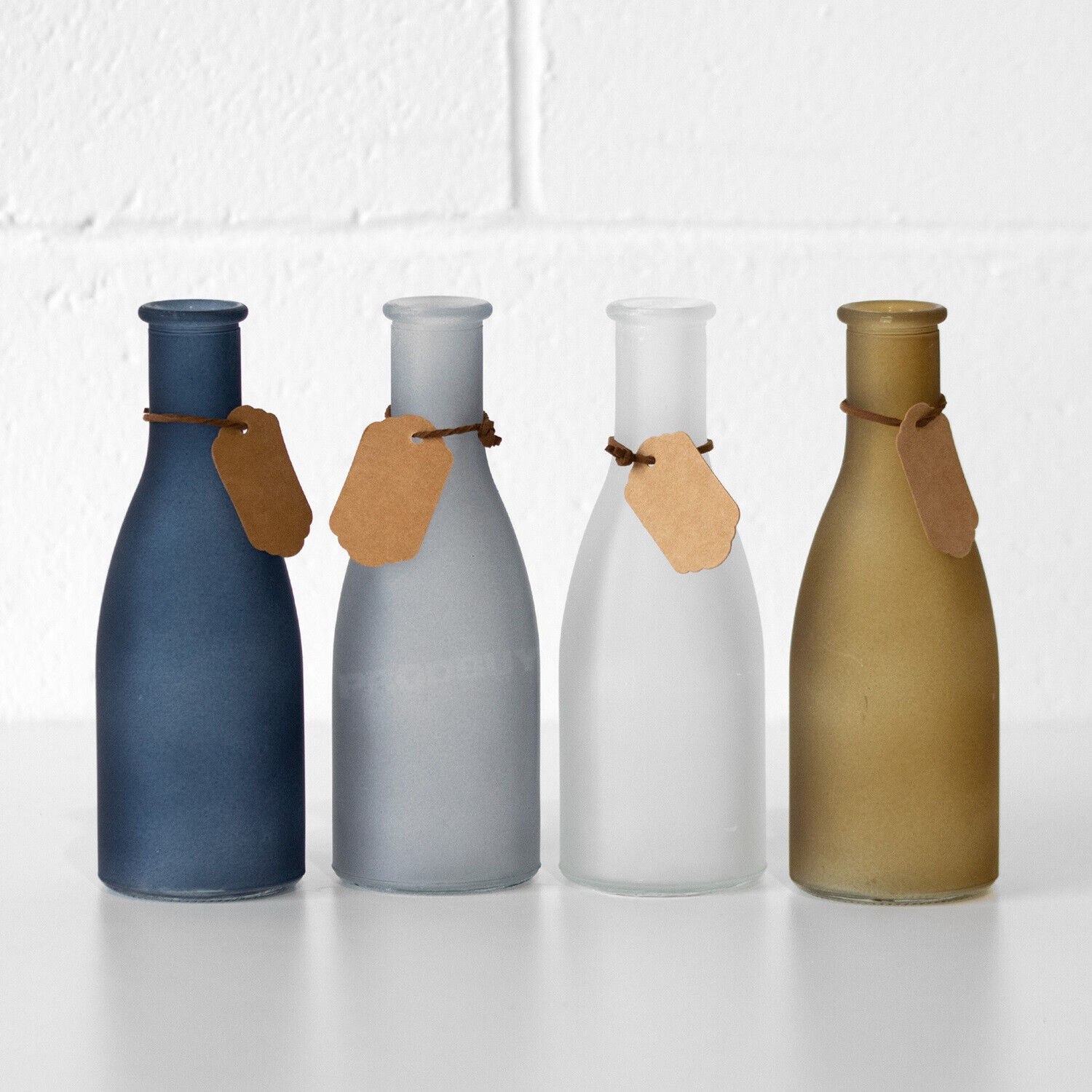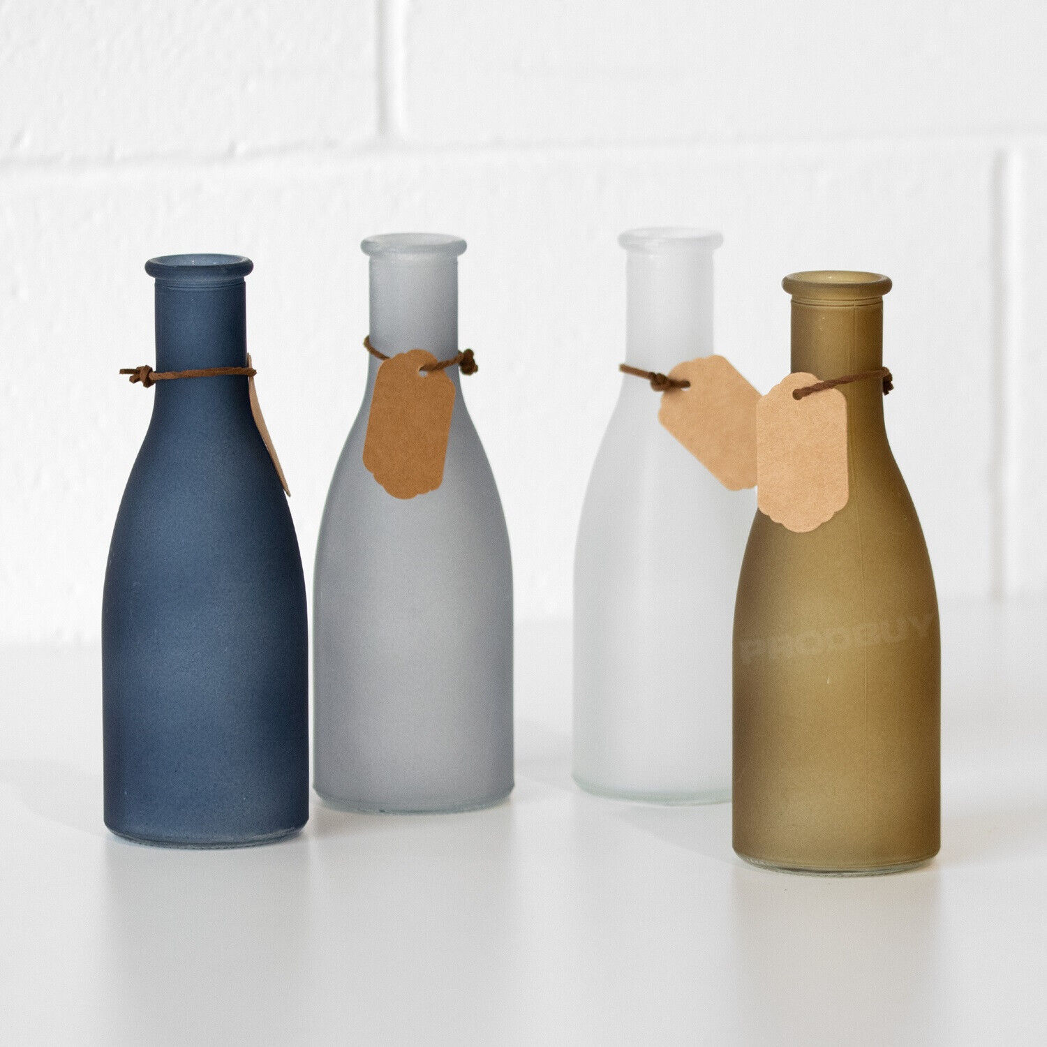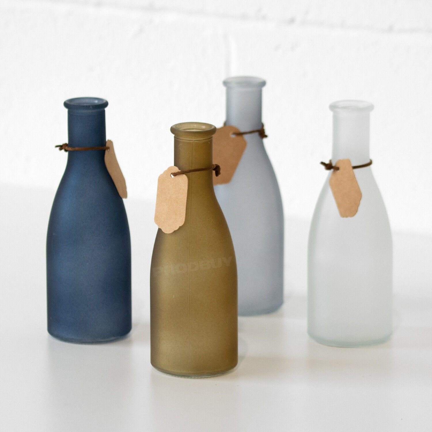 Set of 12 Small Glass Bud Bottle Vases 18cm Tall Frosted Blue Gold Grey Decor
