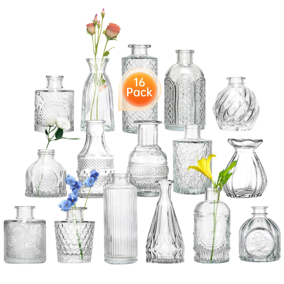 Glass Bud Vases Set of 16, Small Glass Vases for Table Decoration, Small Clear Bud Vases in Bulk, Mini Flowers Vases for Centerpieces, Vintage Small