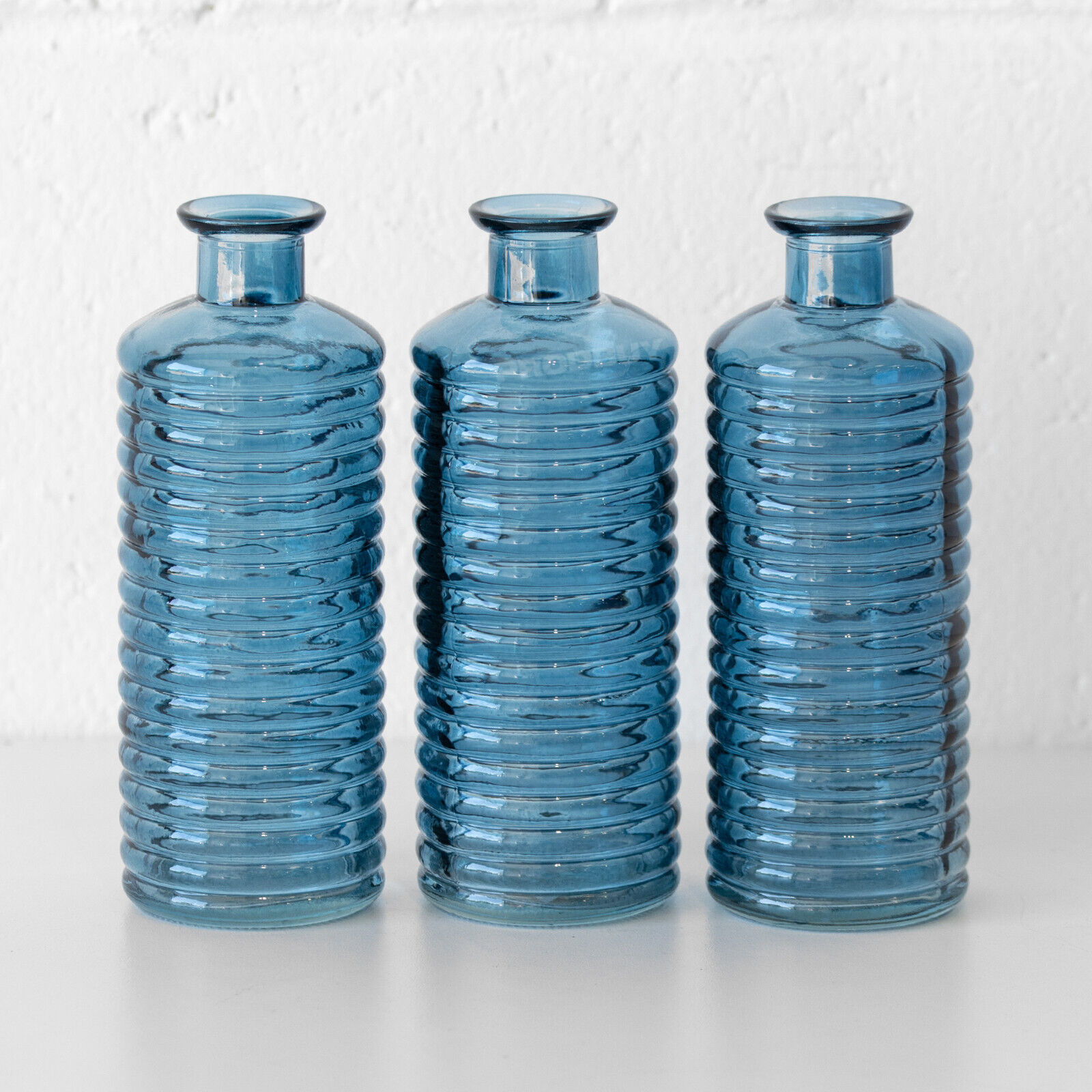 Set of 3 Small Glass Bud Vases 16cm Dark Blue Clear Ribbed Cut Flower Bottles