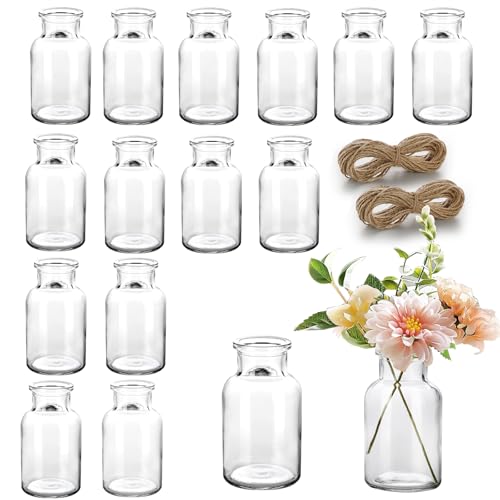 12PCS Small Glass Bud Vases Set, 125ml Mini Vases for Flowers | Rustic Wedding Table Decoration & Home Decor | Includes Jute Twine 6M & Stickers |Handmade Centerpieces for Party Reception Coffee Table