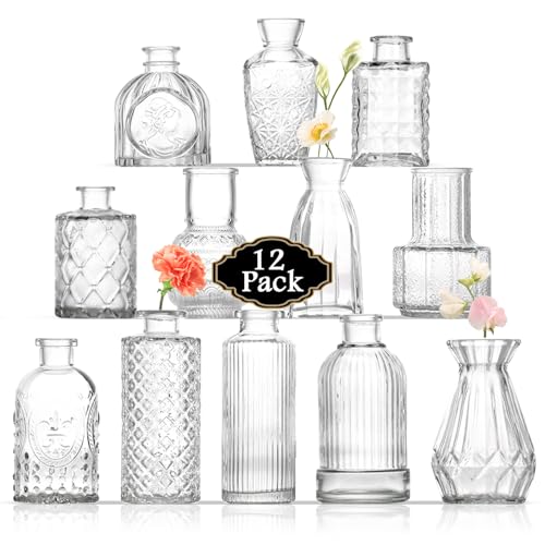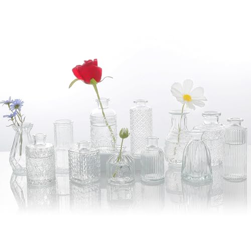 Vmgigig 12PCS Small Glass Bud Vases, Mini Vintage for Flowers, Small Vase Set f