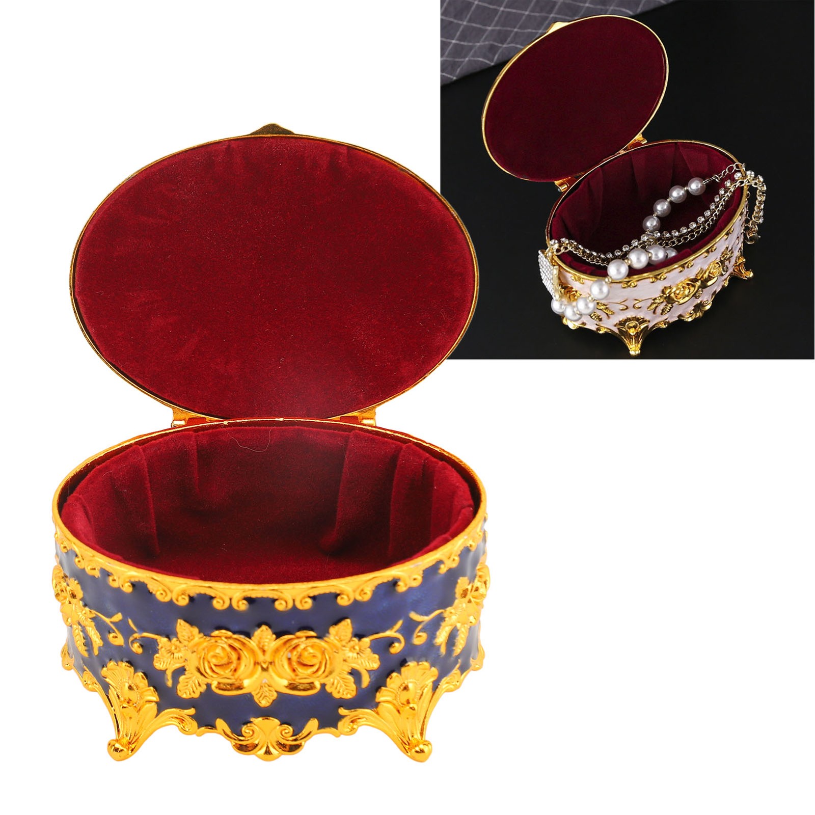 Vintage Round Jewelry Trinket Box Gold Small Earrings Necklace Storage Box Blue