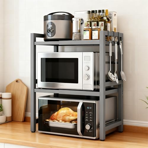 Homullel Expandable Microwave Oven Shelf Unit, Kitchen Countertop Microwave Stand with Shelves, Adjustable Kitchen Counter Rack Small Storage Shelving Unit, Desktop Printer Stand (Grey, 2-Tier)