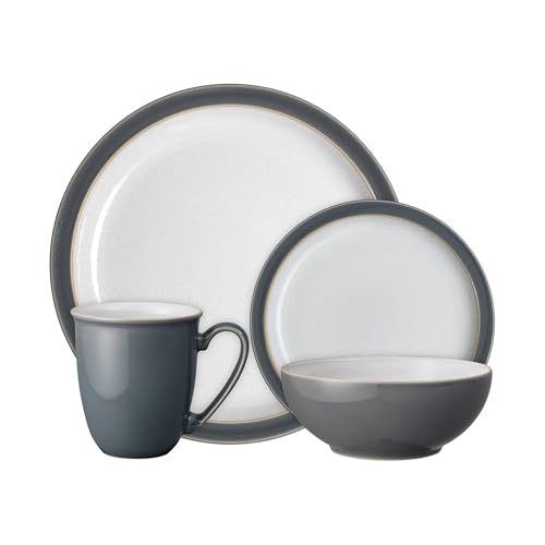 Denby - Elements Fossil Grey Dinner Set For 1 - 4 Piece Ceramic Tableware - Dishwasher Microwave Safe Crockery Single Place Setting - 1 x Dinner Plate, 1 x Small Plate, 1 x Cereal Bowl, 1 x Coffee Mug