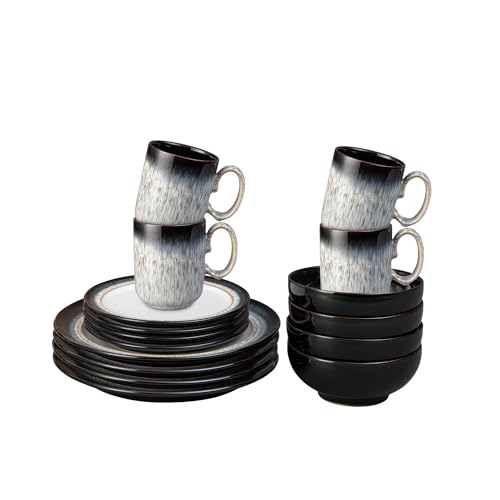 Denby - Halo Dinner Set for 4-16 Piece Tableware - Dishwasher Microwave Safe Stoneware Crockery - Reactive Glaze Black, Grey Colour - Set of 4 Dinner Plates, Small Plates, Cereal Bowls, Coffee Mugs
